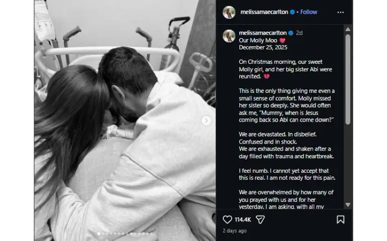 Teška porodična tragedija potresla je javnost nakon što je influenserka Melissa Mae Carlton objavila da je njena ćerka Molly preminula na Božić, samo godinu dana nakon gubitka starije ćerke Abigail.