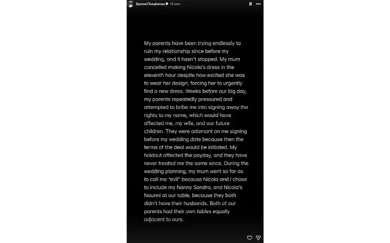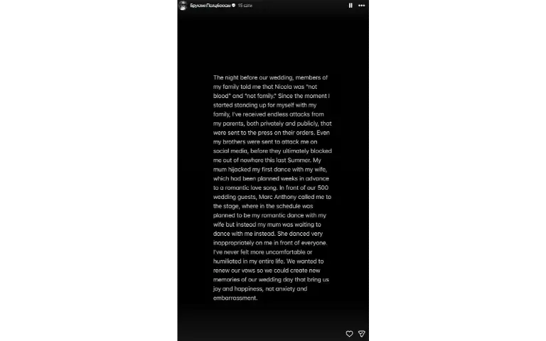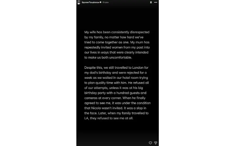 Brooklyn je u svojim Storijima naveo i nekoliko konkretnih situacija u kojima je, kako tvrdi, porodica pokušala da sabotira njegov odnos sa Nicolom Pelz.