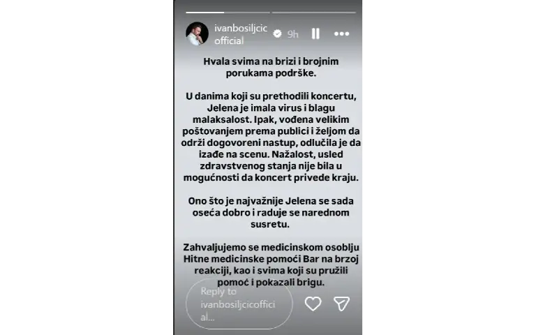 Nakon što se vest proširila društvenim mrežama, oglasio se i suprug pevačice, glumac Ivan Bosiljčić, koji je putem Instagrama uputio zahvalnost svima koji su pružili podršku.U objavi je naveo:"Hvala svima na brizi i brojnim porukama podrške. U danima koji su prethodili koncertu, Jelena je imala virus i blagu malaksalost. Ipak, vođena velikim poštovanjem prema publici i željom da održi dogovoreni nastup, odlučila je da izađe na scenu. Nažalost, usled zdravstvenog stanja nije bila u mogućnosti da koncert privede kraju. Ono što je najvažnije – Jelena se sada oseća dobro i raduje se narednom susretu sa publikom. Zahvaljujemo se medicinskom osoblju Hitne medicinske pomoći Bar na brzoj reakciji, kao i svima koji su pružili pomoć i pokazali brigu.“Prema njegovim rečima, pevačica je prethodnih dana imala virus i blagu iscrpljenost, ali je želela da ispuni obećanje publici. Zbog pogoršanja stanja, koncert ipak nije mogao biti nastavljen.